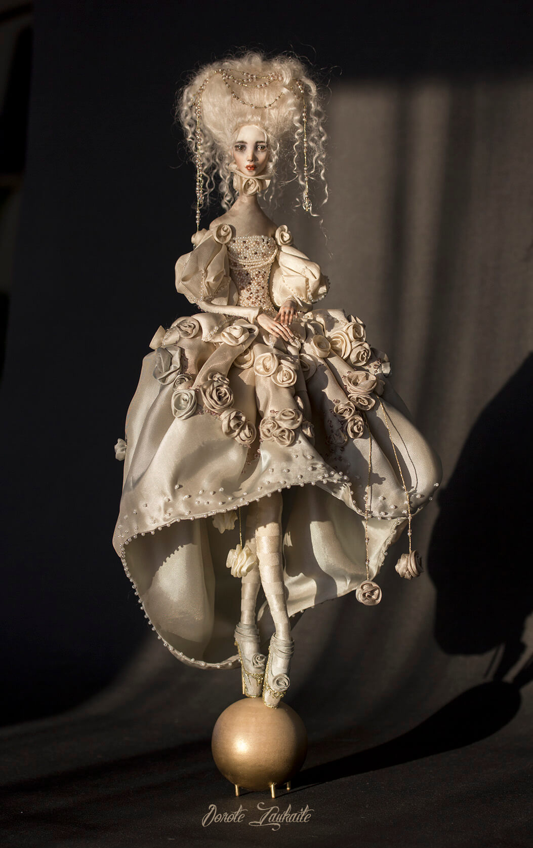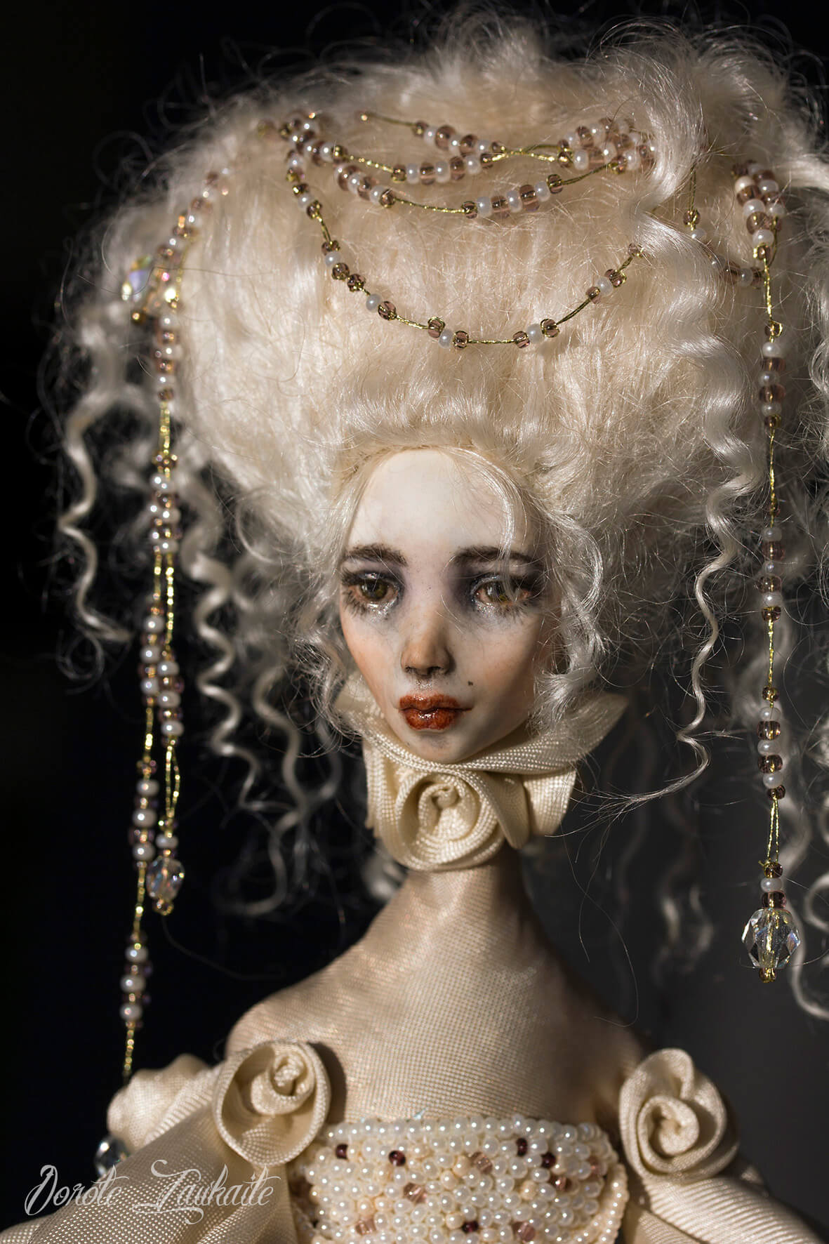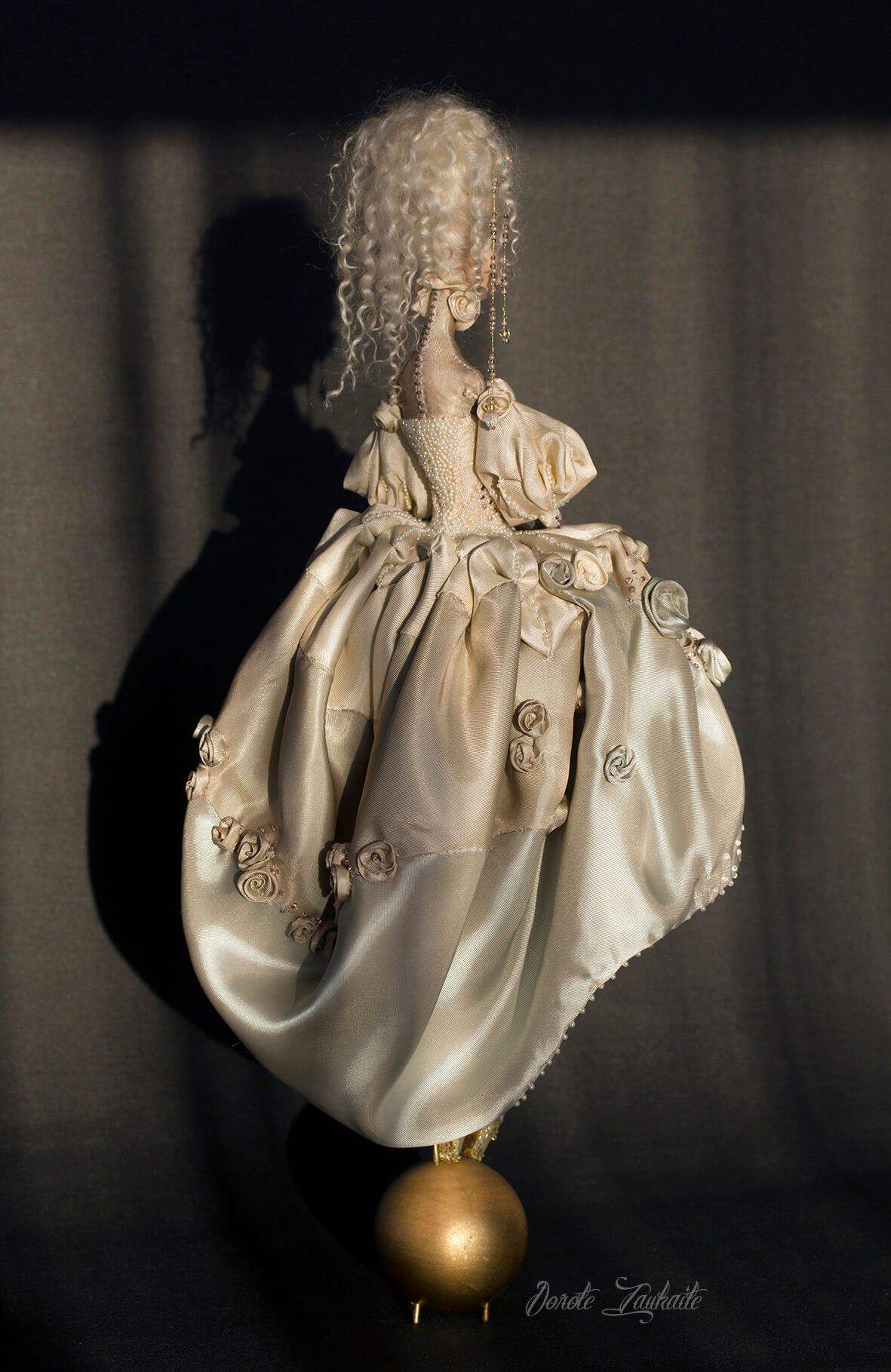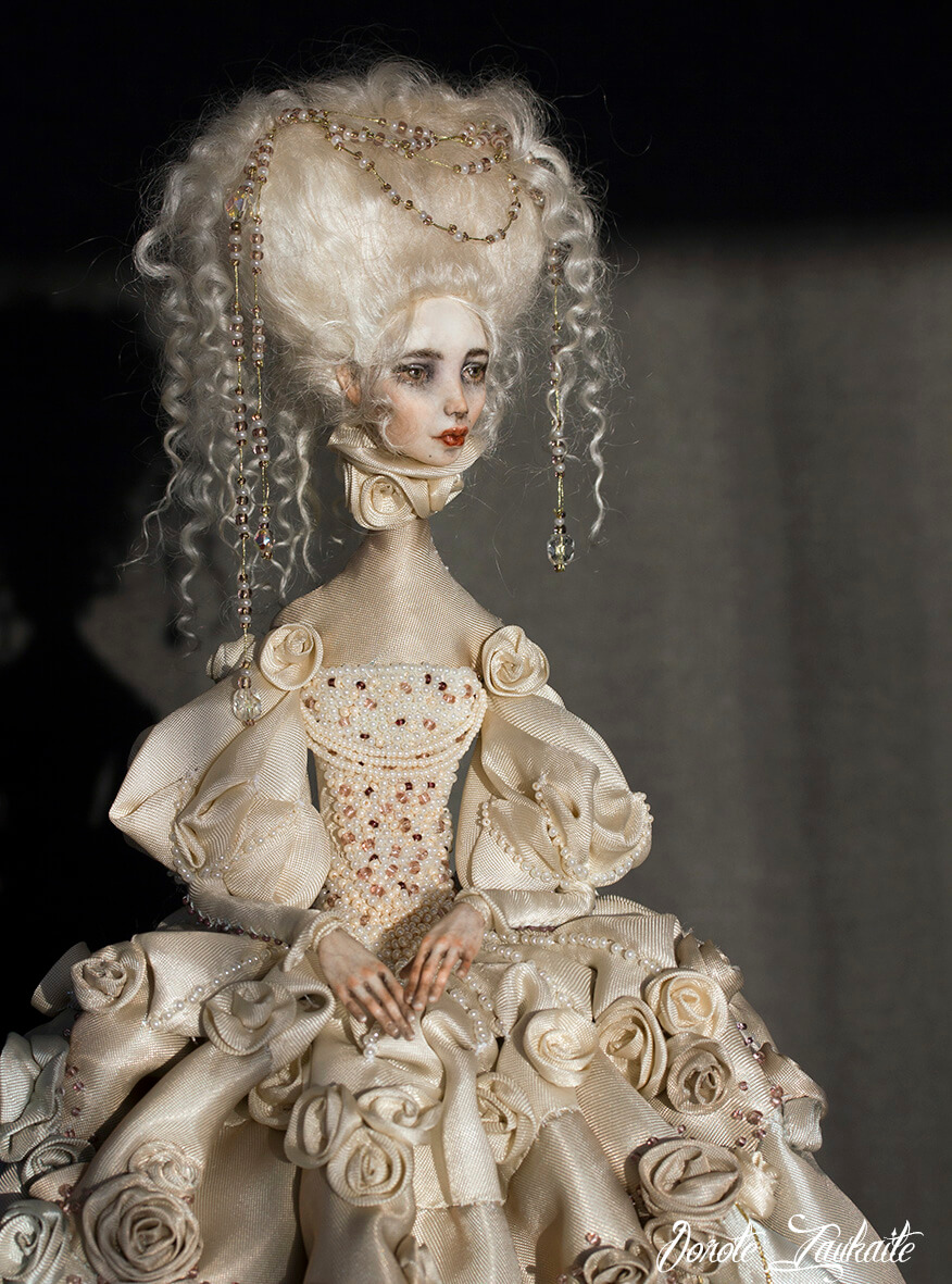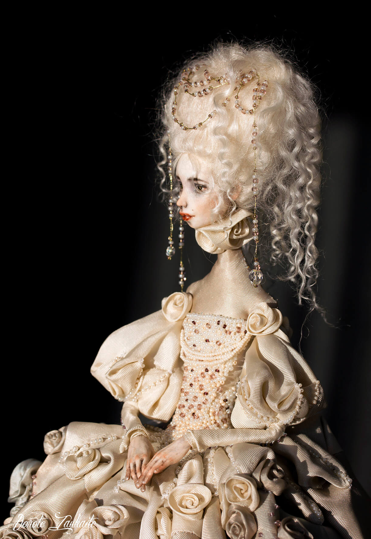 The doll stands 45.5 cm tall, her head and hands were made from porcelain while the body is textile over an armature. The dolls wig is made from natural mohair and decorated with glass microbeads and Swarovski crystals. The dolls dress was hand stitched from viscose silk and decorated with thousands of glass micro beads and roses. The color of the dress is slightly photochromic (appears different each time when the light in the room changes). The costume and the wig are permanently attached to the doll.